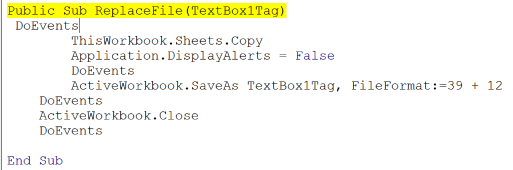 Then function ReplaceFile saves this workbook as %Temp%\libProject.xslx with file format 51 (xlOpenXMLWorkbook). More on excel file format enumeration here.